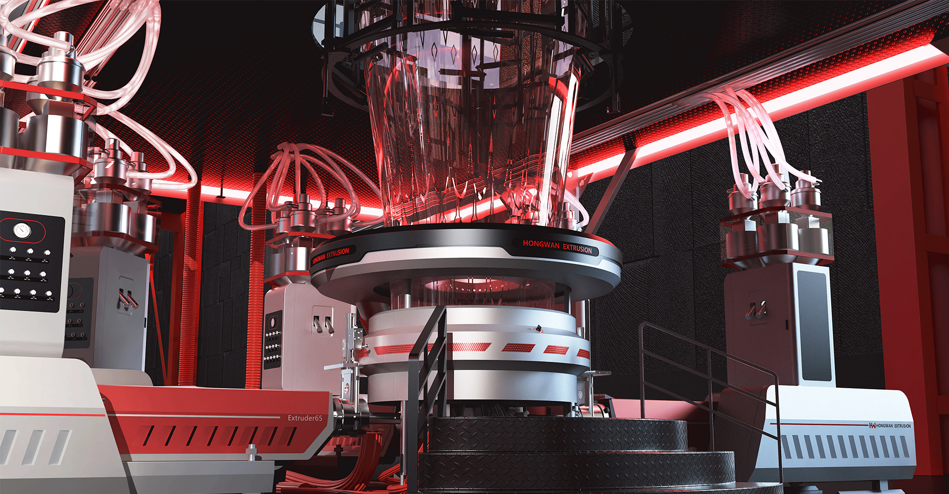 薄膜质量:吹膜设备生产的薄膜应具有优良的物理化学性能,如透明度、拉伸强度、断裂伸长率、透气性等。设计时需关注的关键技术包括:螺杆和吹膜头的优化设计、熔融挤出过程的温度控制、风冷系统的布局等。